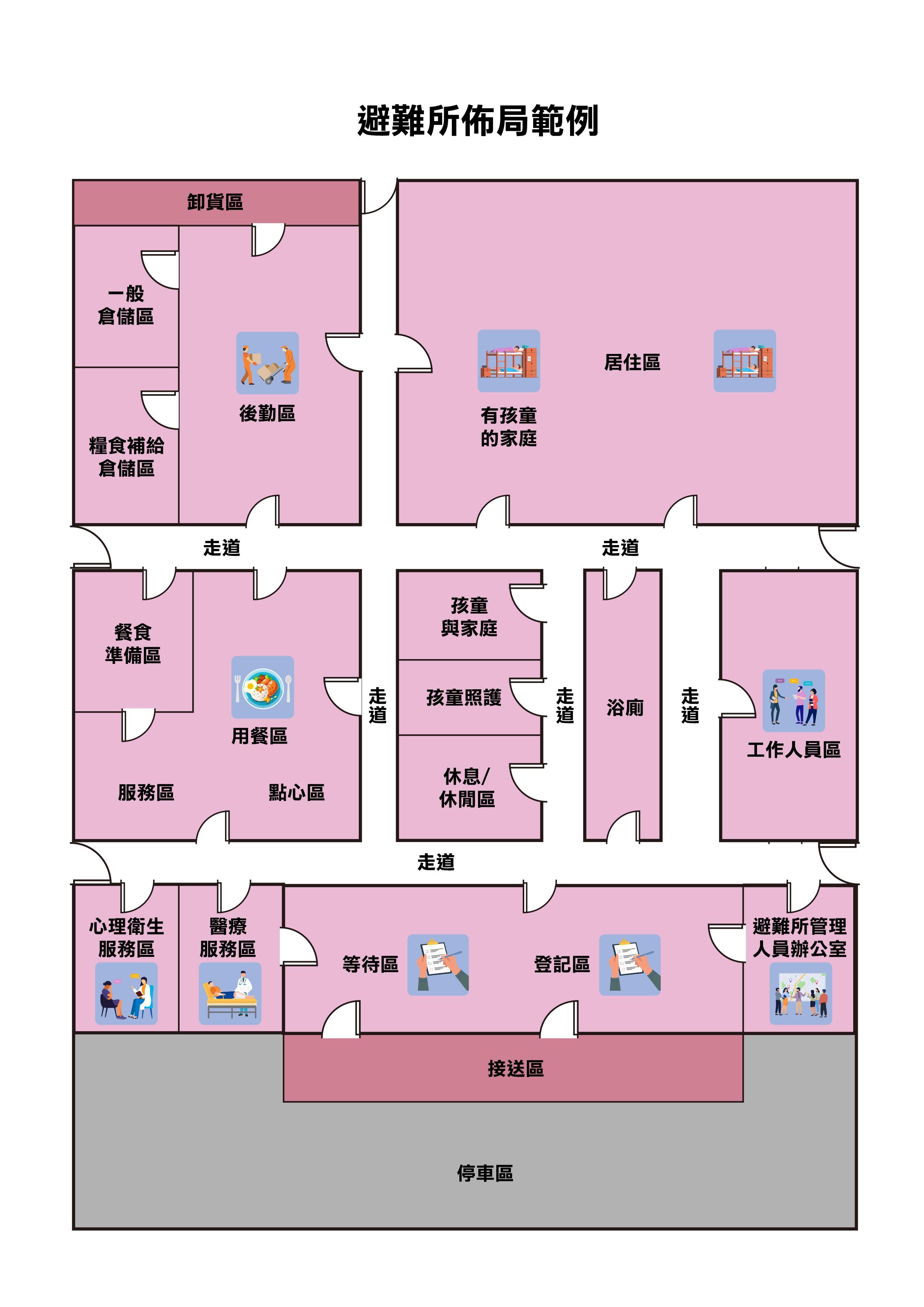 在分配避難所空間時,應考慮設立以下區域,並針對每個區域的進入權限進行規劃。有些區域需要限制一般人的出入,例如物資儲存區、教室、圖書室,或任何存放危險或易損壞物資和設備的區域。